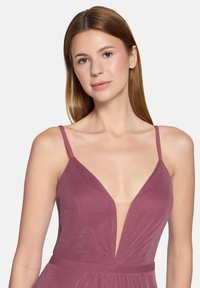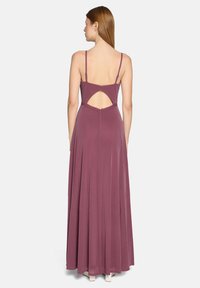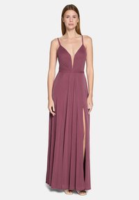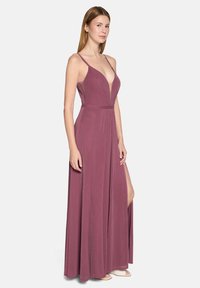 Kobieta stojąca w długiej do ziemi sukni w kolorze wrzosowym z cienkimi ramiączkami, głębokim dekoltem w kształcie litery V oraz wysokim rozcięciem na jednej nodze na białym tle.