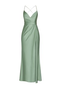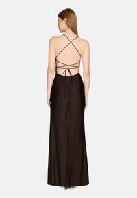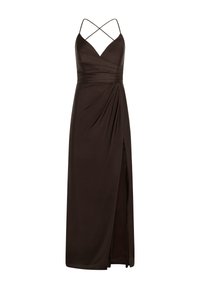 Długa, ciemnobrązowa sukienka na cienkich ramiączkach z dopasowanym gorsetem i rozcięciem do uda; z boku efektowne marszczenie dla dodatkowego detalu.