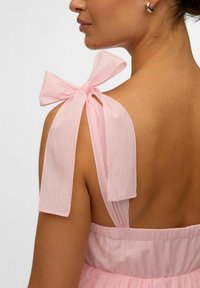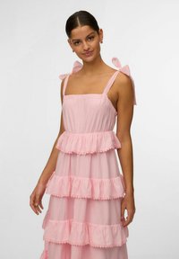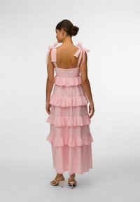 Kobieta ubrana w różową, bezrękawnikową, warstwową suknię maxi z paskami związanymi na kokardę oraz w beżowe sandały na cienkich paskach, na tle jednolitego szarego tła.
