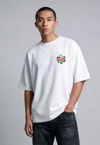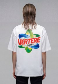 Osoba z krótkimi włosami w białej koszulce z kolorowym wzorem przypominającym atom i napisem "VERTERE CLEAN CUTS" z tyłu.