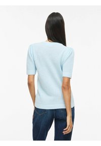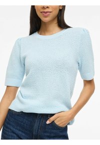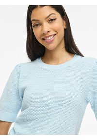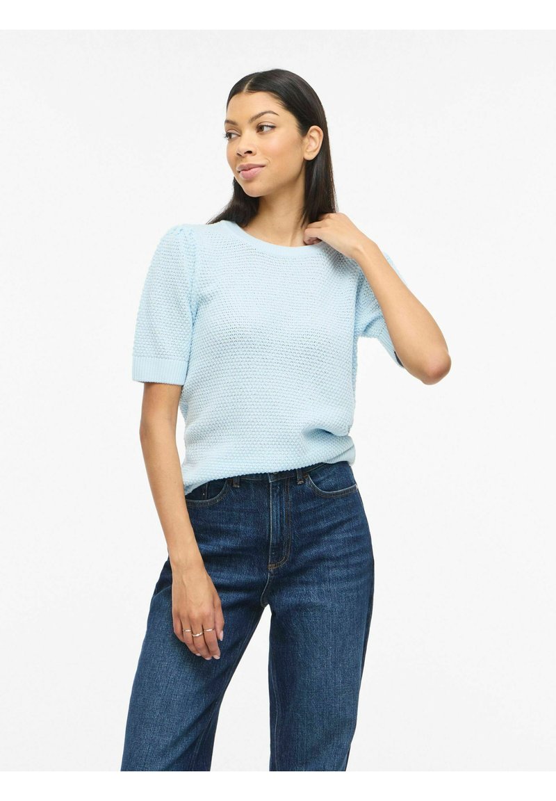 Jasnoniebieski sweter dziany z krótkimi rękawami i okrągłym dekoltem, zestawiony z ciemnymi jeansami. Tekstura wydaje się wypukła i tkana.