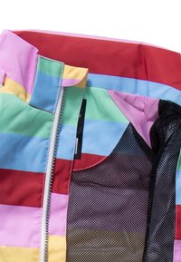 Dziecięca kurtka przeciwdeszczowa z kapturem, z poziomymi paskami w pastelowych kolorach: różowym, żółtym, zielonym, niebieskim i czerwonym, z dwoma zamykanymi na zamek błyskawiczny przednimi kieszeniami oraz regulowanymi mankietami.