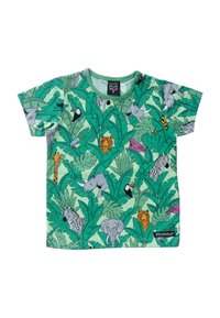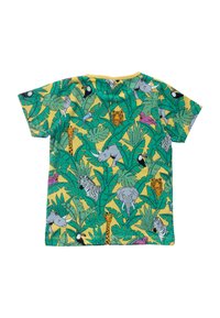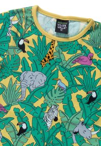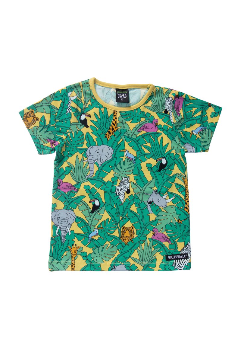 Koszulka dziecięca z krótkim rękawem w zielone tropikalne liście i kolorowe zwierzęta dżungli, takie jak słonie, żyrafy, tukany, zebry i flamingi na żółtym tle.