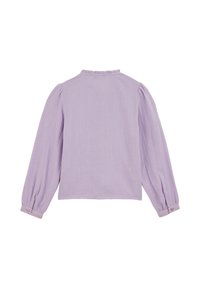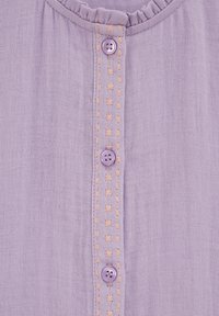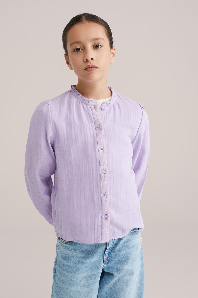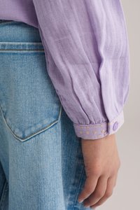 Jasnofioletowa, długorękawowa koszula z bufiastymi ramionami, okrągłym dekoltem i zapinana na guziki z delikatnym różowym przeszyciem wzdłuż paska zapinającego.