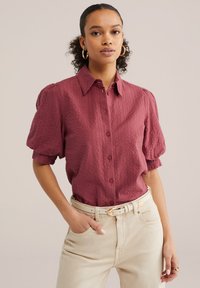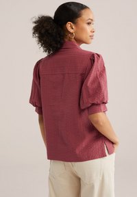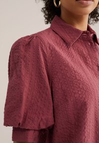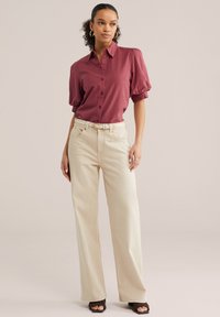 Kobieta o kręconych włosach nosi teksturowaną bordową bluzkę z bufkami oraz kremowe spodnie z beżowym paskiem, pozując z jedną ręką w kieszeni.