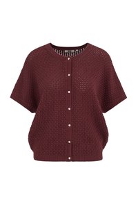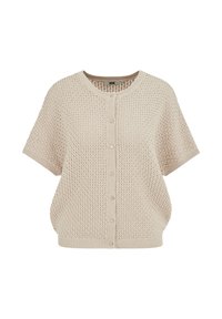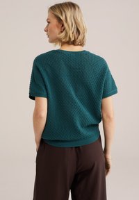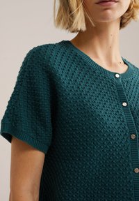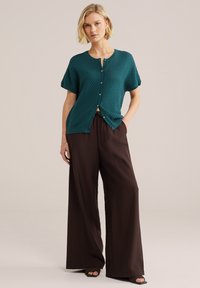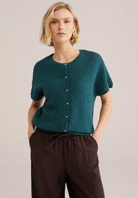 Kobieta o krótkich blond włosach, ubrana w turkusowy, teksturowany krótki sweter na guziki z krótkim rękawem oraz luźne, ciemnobrązowe spodnie, z rękami w kieszeniach.