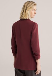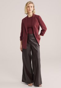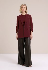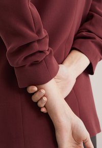 Kobieta o krótkich blond włosach, ubrana w burgundową marynarkę, pasujący top, ciemne spodnie, kolczyki koła, z ręką w kieszeni na neutralnym tle.