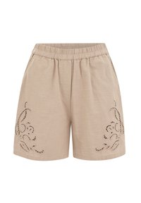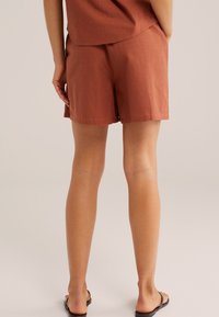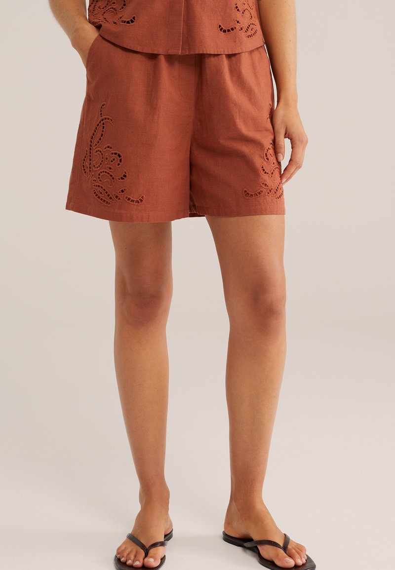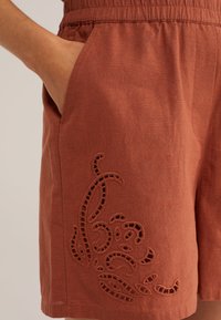 Szorty w kolorze rdzy z haftem w formie kwiatowych wycięć, noszone z dopasowanym topem i czarnymi japonkami, modelka stoi z lewą ręką w kieszeni.