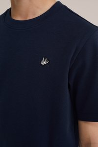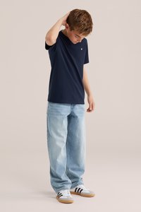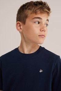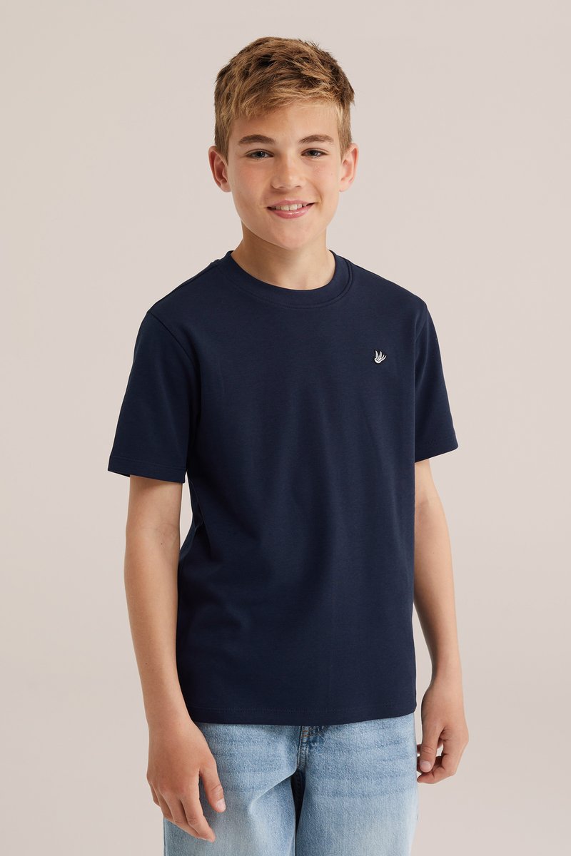 Uśmiechnięty nastoletni chłopiec z krótkimi jasnobrązowymi włosami, ubrany w granatową koszulkę z krótkim rękawem i jasnoniebieskie dżinsy na jednolitym tle.