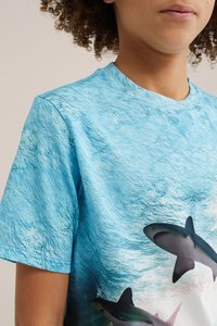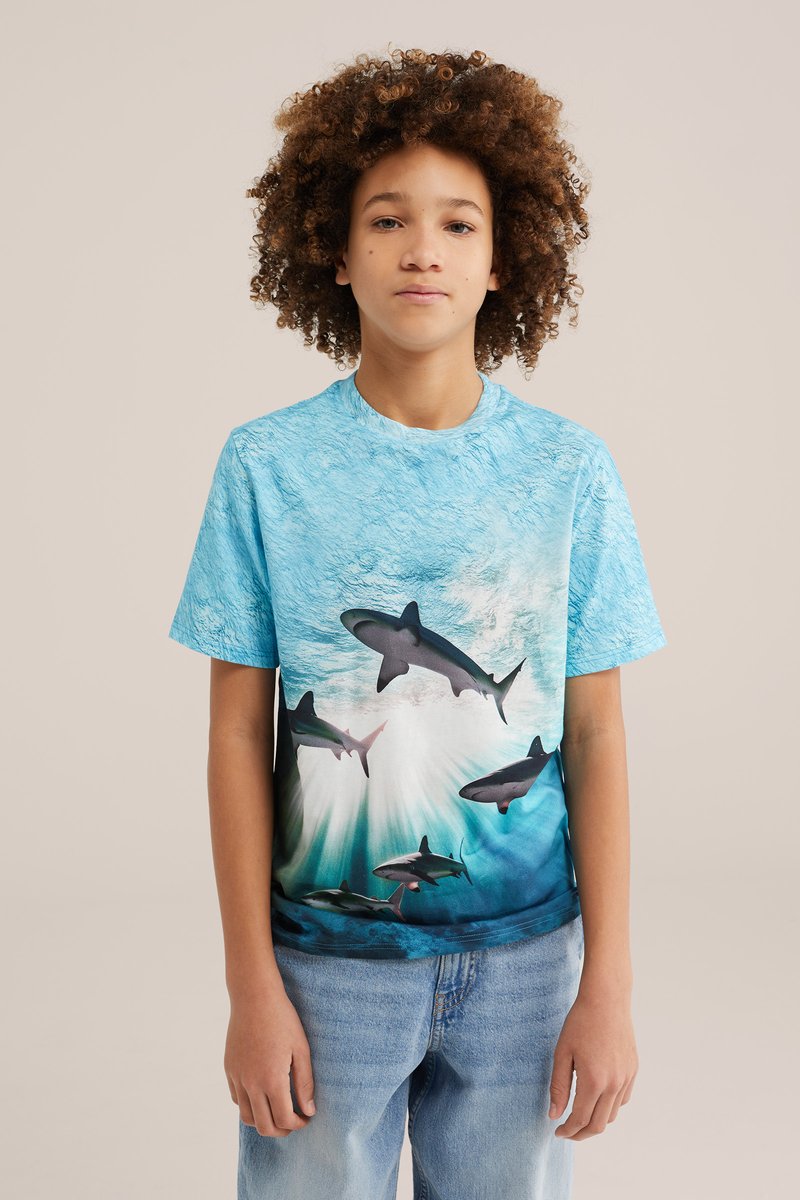 Chłopiec z kręconymi włosami noszący niebieską koszulkę z wieloma rekinami pływającymi pod wodą, przez którą przebijają się promienie słoneczne.