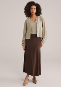 Kobieta o kręconych włosach ubrana w beżowy, bezrękawnik i brązową spódnicę z wysokim stanem, stojąca na jednolitym jasnym tle.