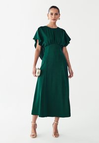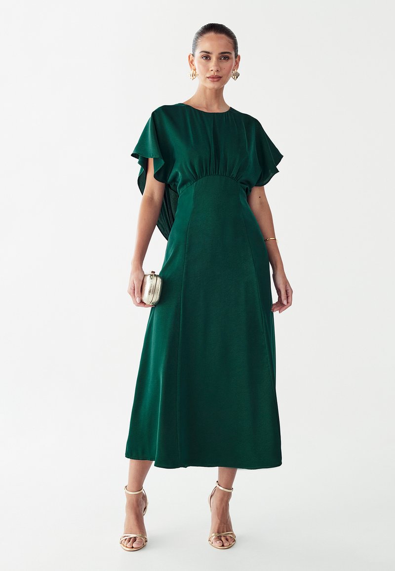 Zielona sukienka o średniej długości z marszczoną talią, rozkloszowanymi rękawami i gładką fakturą. Do tego mała metaliczna torebka kopertowa i sandały na paski.