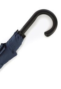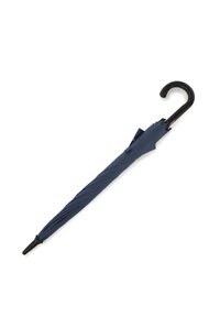 Niebieski otwarty parasol z czarnym zakrzywionym uchwytem skierowany w prawo na białym tle.