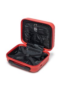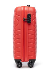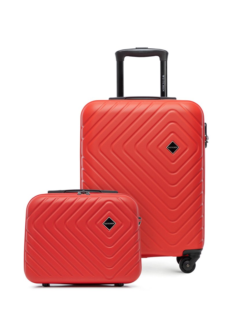 Zestaw dwóch czerwonych walizek z twardą skorupą, ozdobionych ukośnymi wypukłymi liniami, jedna duża na kółkach z wysuwanym uchwytem, druga mniejsza z rączką.