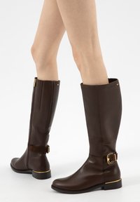 Kobieta w brązowej skórzanej kurtce, beżowej bluzce, beżowej zapinanej na guziki spódnicy oraz ciemnobrązowych kozakach za kolano, pozująca na jednolitym tle.