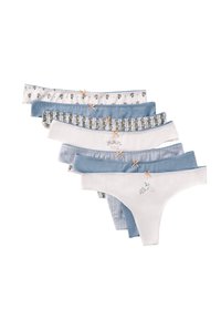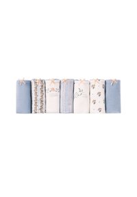 Kobieta ubrana w biały prążkowany krótki top i białą bieliźnianą bieliznę w stylu bikini z małą pomarańczową kokardką na środku przodu, na jednolitym tle.