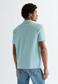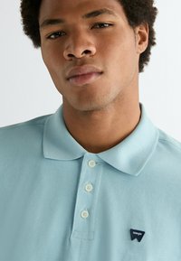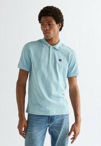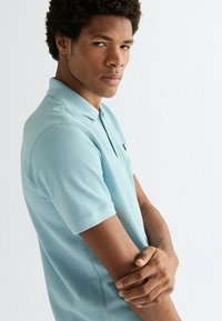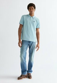 Mężczyzna ubrany w jasnoniebieską koszulkę polo z krótkim rękawem i trzema guzikami oraz niebieskie dżinsy, stojący na jednolitym białym tle.