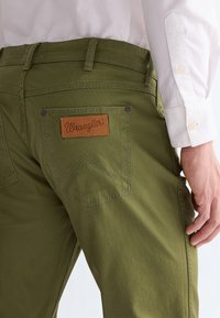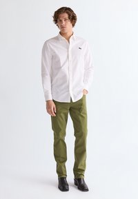 Oliwkowe bawełniane chinosy z prostą nogawką, z przednimi kieszeniami, z zapięciem na guzik, w połączeniu z czarno-białymi trampkami.