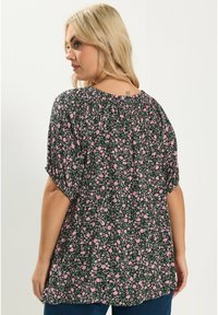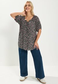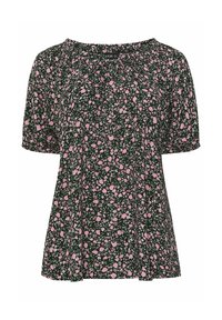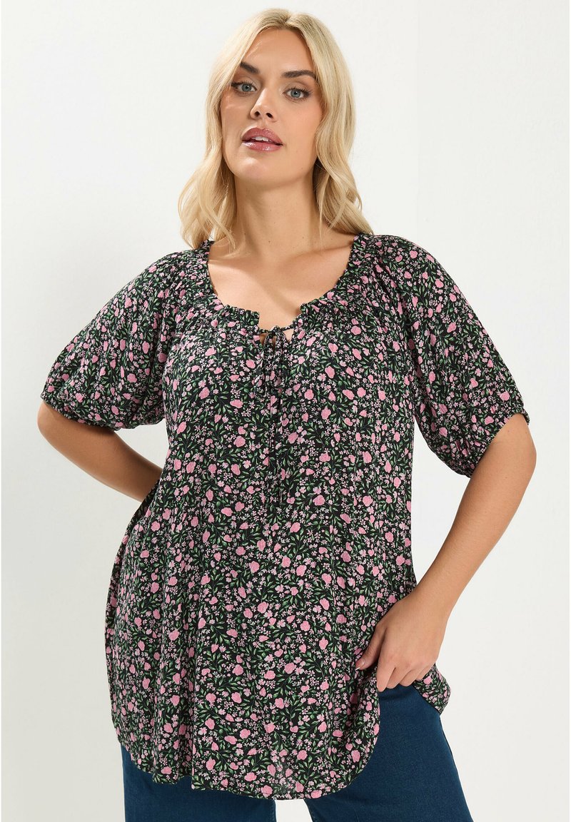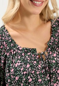 Kobieta o blond włosach nosi czarną bluzkę w różowy kwiatowy wzór z bufkami na krótkich rękawach, stojąc z jedną ręką na biodrze.