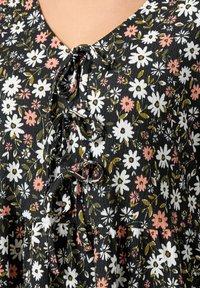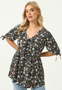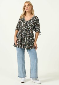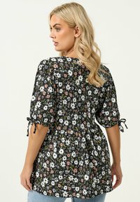 Blondynka w czarnej bluzce w kwiaty z białymi i różowymi kwiatami, z bufkami związanymi przy łokciach, stojąca z rękami na biodrach.