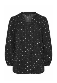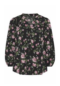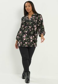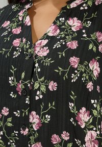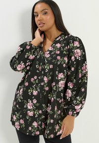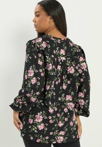 Kobieta z długimi ciemnymi włosami, ubrana w czarną kwiecistą bluzkę na guziki z długimi bufkami, pozująca z jedną ręką przy szyi.