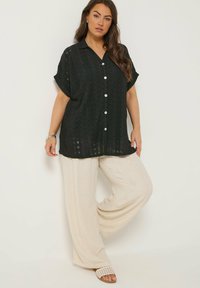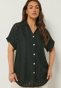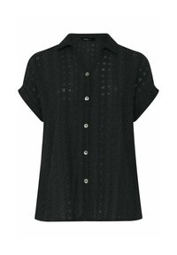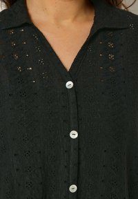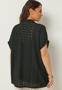 Kobieta ubrana w czarną, krótkorękawową bluzkę na guziki z ażurowym wzorem oraz podwiniętymi mankietami, w komplecie z srebrną bransoletką na lewej ręce.