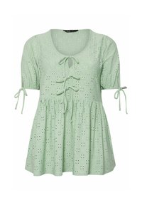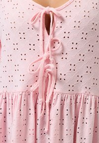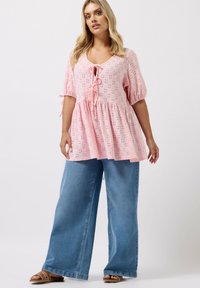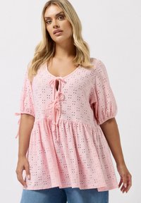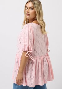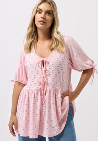 Blondynka w jasnoróżowej bluzce z ażurowej tkaniny z wiązaniem z przodu i bufkami o długości do łokcia, w połączeniu z niebieskimi dżinsami, na białym tle.