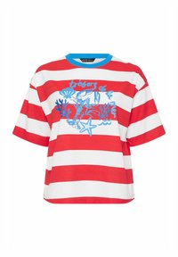 Kobieta ubrana w niebiesko-białą, szeroką koszulkę w paski z czerwonym kołnierzykiem i grafiką pomidora z francuskim tekstem z przodu.