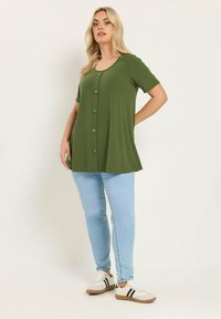Blondynka w zielonym bluzce na krótki rękaw z guzikami i jasnoniebieskich dżinsach, pozująca z jedną ręką za szyją.