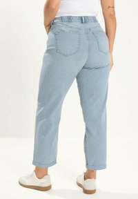 Kobieta w podwiniętych jasnoniebieskich dżinsach i białych tenisówkach, stojąca na białym tle z jedną ręką w kieszeni.