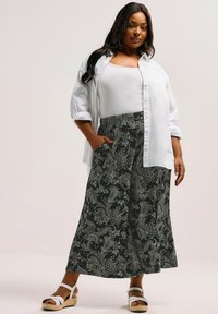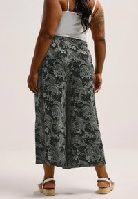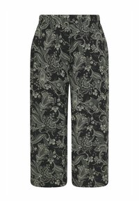 Kobieta ubrana w czarne spodnie o szerokich nogawkach z białym kwiatowym wzorem paisley, biały bezrękawnik oraz białe sandały na koturnie, stojąca z ręką na biodrze.
