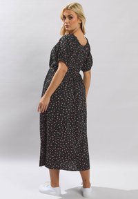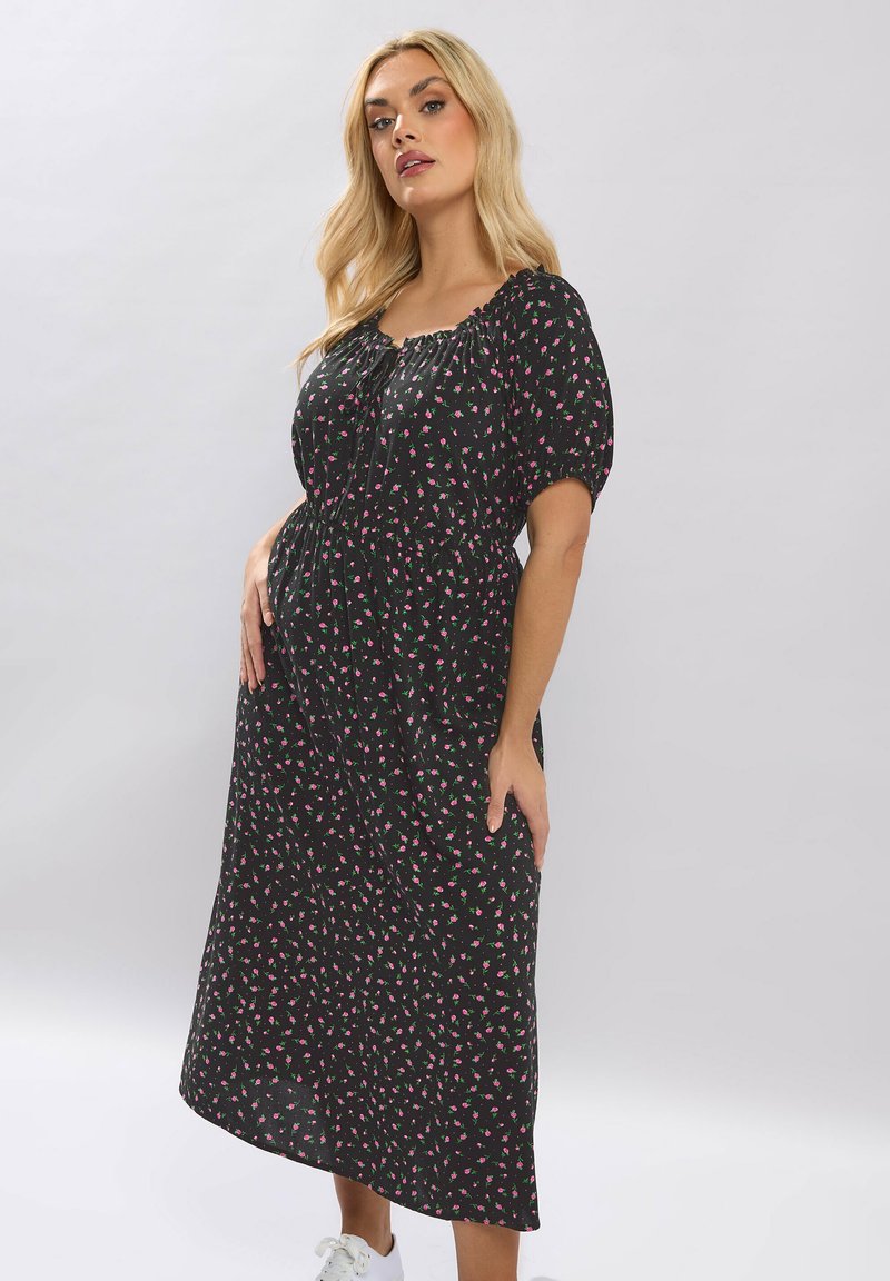 Blondynka w czarnej, kwiatowej sukience midi z bufkami, pozująca na jednolitym jasnoszarym tle.