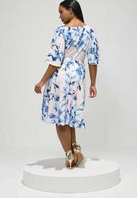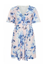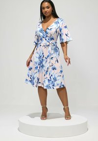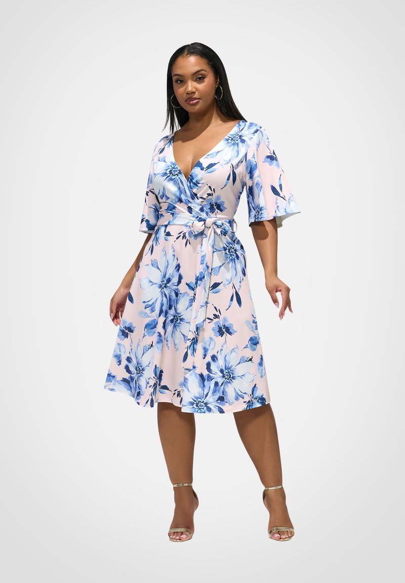 Kobieta ubrana w jasnoróżową sukienkę kopertową sięgającą do kolan, z niebieskim kwiatowym wzorem, rękawami do łokcia, wiązaną w talii, oraz złote sandały na obcasie z paskiem wokół kostki.