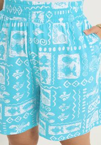 Blondynka z rozpuszczonymi włosami, ubrana w biały T-shirt, niebieskie szorty w wzory, bransoletki, trzymająca okulary przeciwsłoneczne nad głową.