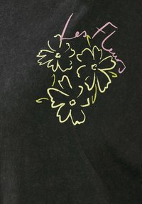 Kobieta stojąca tyłem, ubrana w czarny, oversize'owy T-shirt z różowym i zielonym wzorem kwiatów w wazonie oraz tekstem "Les Fleurs", "Flower Market", "1987", "Paryż, Francja".
