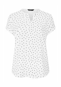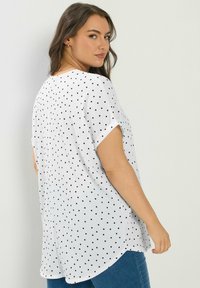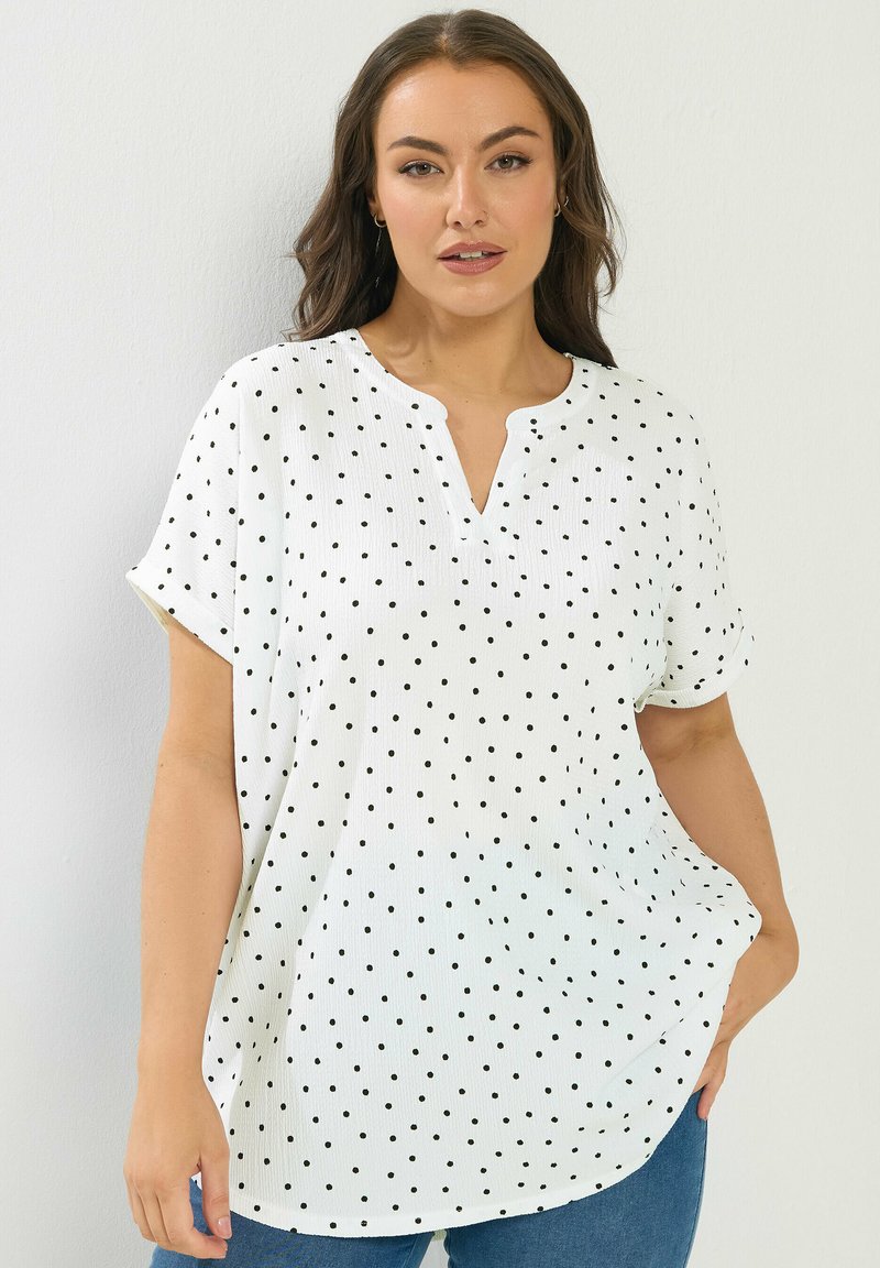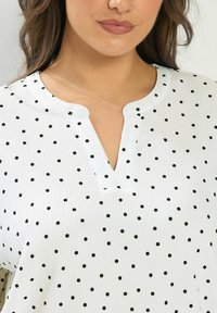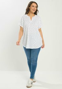 Kobieta ubrana w białą bluzkę z krótkim rękawem w czarne kropki, z dekoltem w kształcie litery V, oraz niebieskie dżinsy, pozująca na tle jednolitego jasnego tła.
