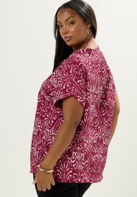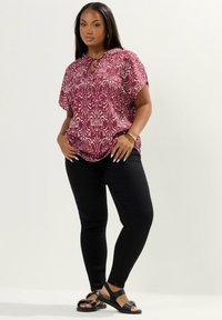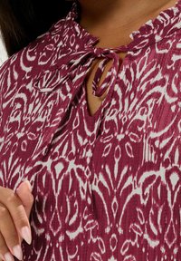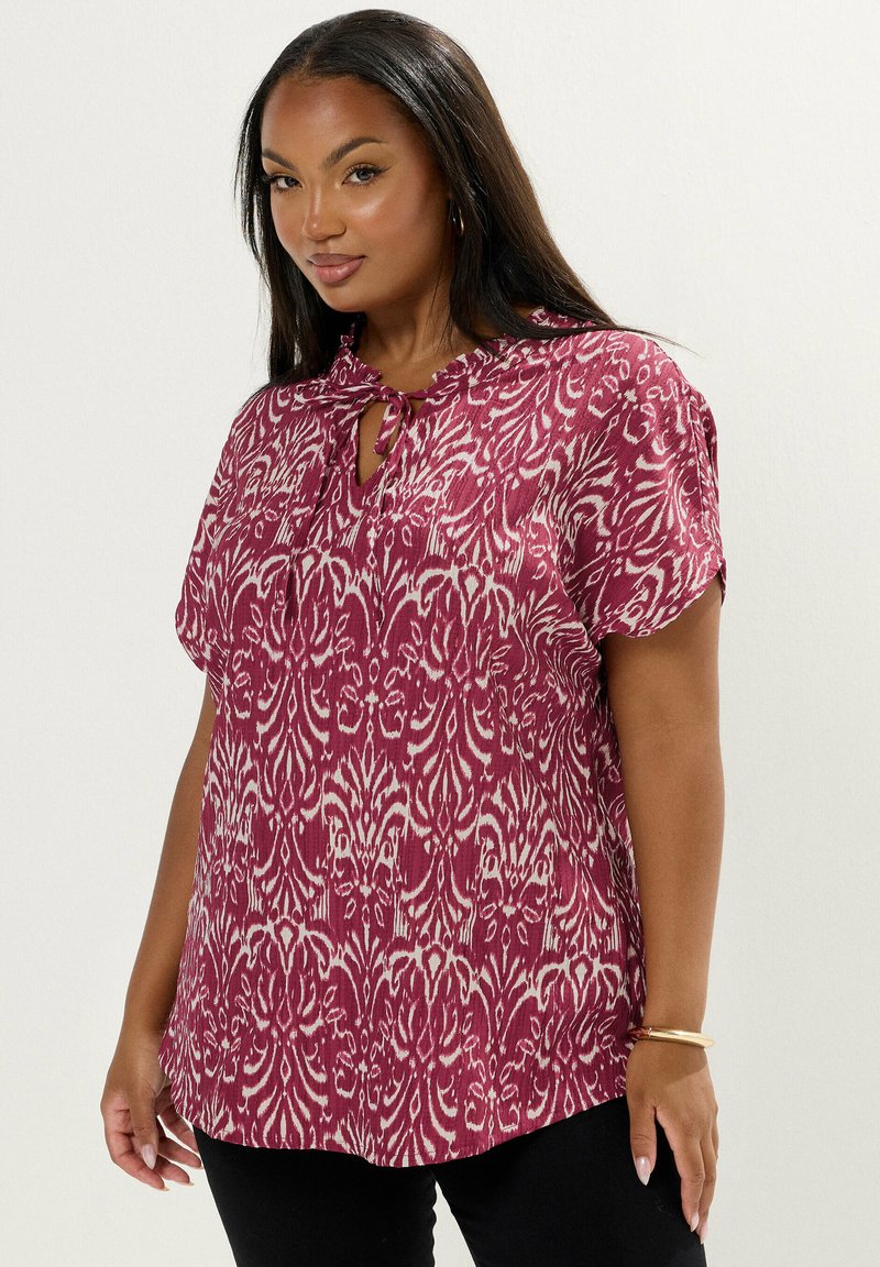 Kobieta ubrana w bordową bluzkę z krótkim rękawem, ozdobioną białymi abstrakcyjnymi wzorami i z wiązaniem przy dekolcie, w połączeniu z czarnymi spodniami i złotą bransoletką.