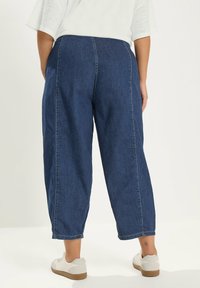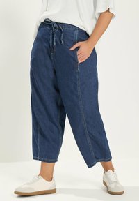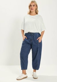 Osoba ubrana w luźne ciemnoniebieskie spodnie dżinsowe do połowy łydki z wiązanym paskiem w talii i białe trampki, stojąca z jedną ręką w kieszeni.