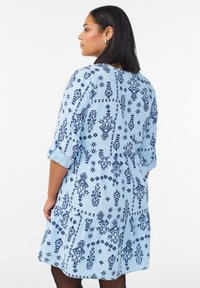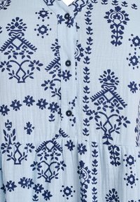 Kobieta o średniej długości czarnych włosach, ubrana w jasnoniebieską sukienkę z ciemnoniebieskim kwiatowym wzorem, stojąca z rękami za plecami na białym tle.