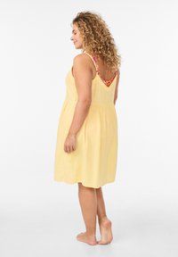 Uśmiechnięta kobieta o kręconych włosach, ubrana w żółtą, bezrękawnikową sukienkę, trzymająca się za spódnicę, pokazująca różę wytatuowaną na lewym przedramieniu.