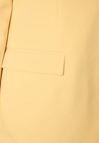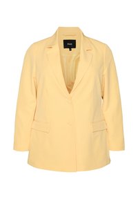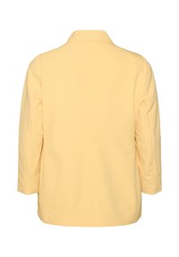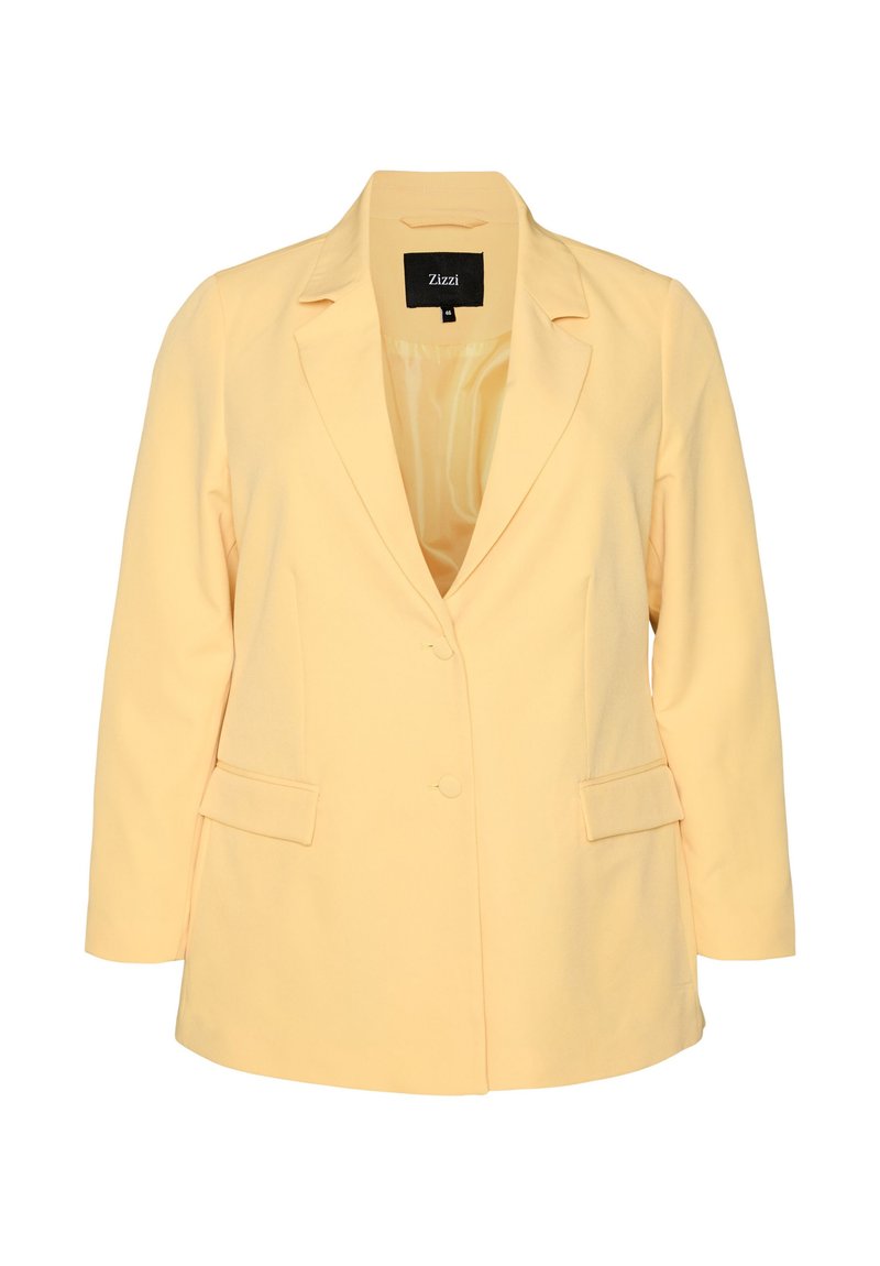 Jasnożółta damska marynarka z klapą z wycięciem, dwoma kieszeniami z patkami z przodu, dwoma guzikami i gładką podszewką, rozmiar 46 marki Zizzi.